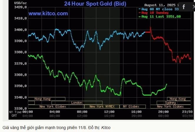 Chốt phiên giao dịch 11/8, giá vàng thế giới giao ngay giảm 55 USD, về 3.341 USD một ounce. Thị trường đi xuống sau khi Tổng thống Mỹ Donald Trump thông báo trên mạng xã hội Truth Social rằng nước này "không áp thuế nhập khẩu vàng". Sang phiên sáng 12/8, giá hiện nhích lên 3.351 USD.